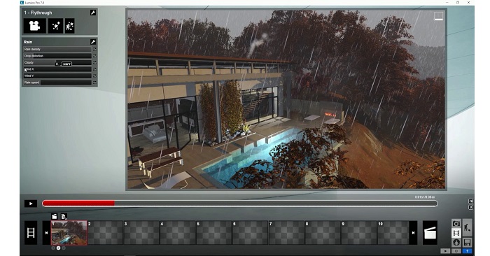 در لومیون میتوان به خوبی و به آسانی شرایط مختلف آبوهوایی را شبیهسازی کرد و رندر بارانی، آفتابی، برفی و مهآلود گرفت.
